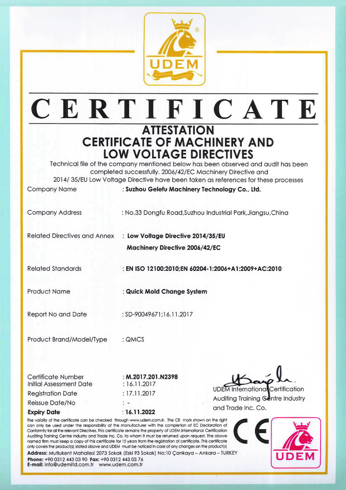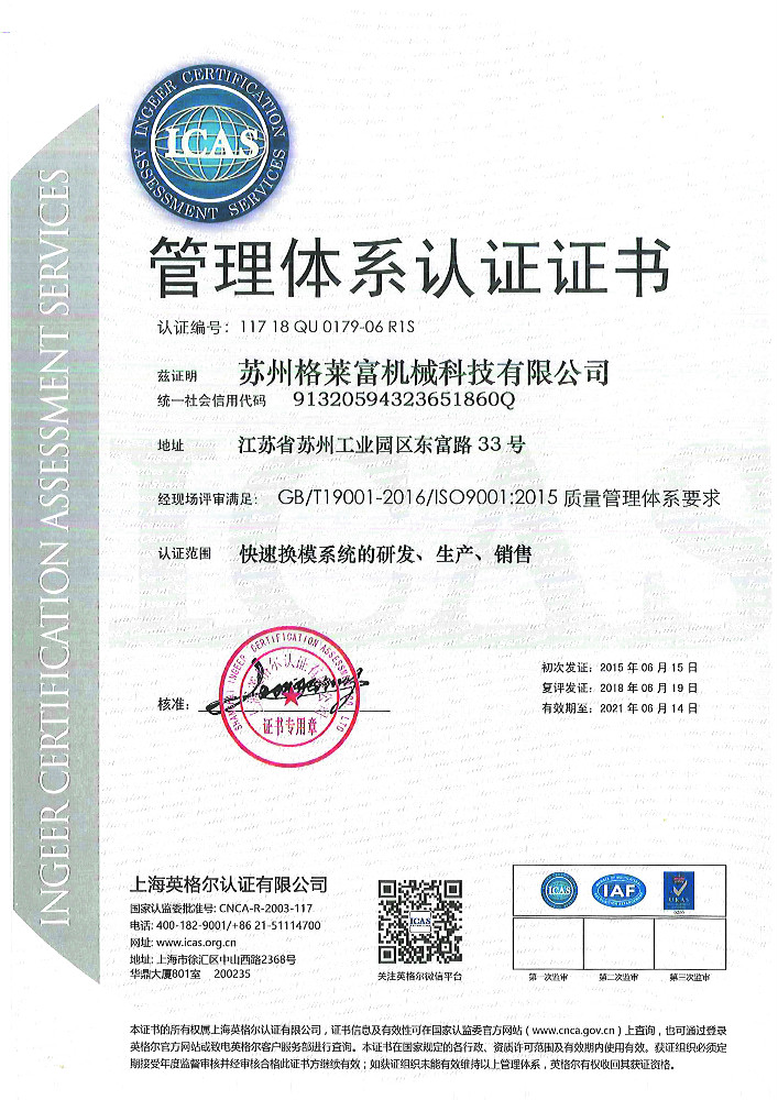 蘇州格萊富機(jī)械科技有限公司坐落于風(fēng)景秀麗的蘇州工業(yè)園區(qū),是一家專注于快速換模系統(tǒng)研發(fā)、設(shè)計(jì)、生產(chǎn)、銷售及服務(wù)為一體的標(biāo)桿型供應(yīng)商。公司現(xiàn)已榮獲國(guó)家高新技術(shù)企業(yè)、江蘇省科技型中小技術(shù)企業(yè)等多項(xiàng)稱號(hào),共獲得70余項(xiàng)國(guó)家發(fā)明專利,產(chǎn)品均已通過歐盟C E,ISO9001質(zhì)量管理體系等認(rèn)證。面對(duì)市場(chǎng)不斷出現(xiàn)的新挑戰(zhàn),格萊富助力企業(yè)發(fā)展,為工業(yè)生產(chǎn)提供模具裝夾、模具快換、模具搬運(yùn)、模具倉(cāng)儲(chǔ)等完善的換模自動(dòng)化整體解決方案。使企業(yè)不但實(shí)現(xiàn)模具快速更換、智能轉(zhuǎn)運(yùn)、精益生產(chǎn),還提高效率,優(yōu)化工藝,強(qiáng)化競(jìng)爭(zhēng)優(yōu)勢(shì)。