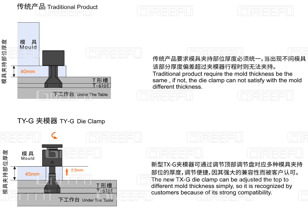 傳統(tǒng)產(chǎn)品要求模具夾持部位厚度必須統(tǒng)一,當(dāng)出現(xiàn)不同模具該部分厚度偏差超過夾模器行程時(shí)則無法夾持。新型TX-G夾模器:可通過調(diào)節(jié)頂部調(diào)節(jié)盤對應(yīng)多種模具夾持 部位的厚度,調(diào)節(jié)便捷,因其強(qiáng)大的兼容性而被客戶認(rèn)可。